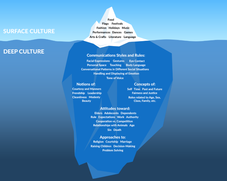 Neste caso, penso que uma das melhores analogias já feitas é a do antropólogo americano Edward T. Hall que comparou a análise de uma cultura a um iceberg. Assim como ocorre nesta geleira cuja parte fora d’água é justamente a menor porção de sua grande estrutura (e a mais rapidamente identificável), os aspectos mais visíveis e detectáveis de uma cultura também correspondem ao seu menor pedaço. É nesta área que se encontram aqueles exemplos do começo do texto e que normalmente associamos à cultura como língua, comida, danças, literatura, música, festivais, artes e artesanatos, etc.